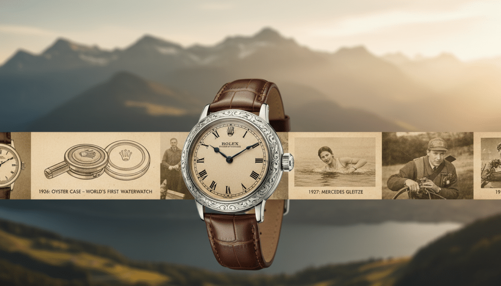 | 1927 | Mercedes Gleitze überquert den Ärmelkanal mit einer Rolex Oyster | Erfolgreiche Demonstration der Wasserdichtigkeit und Robustheit der Oyster-Uhr in extremen Bedingungen. |