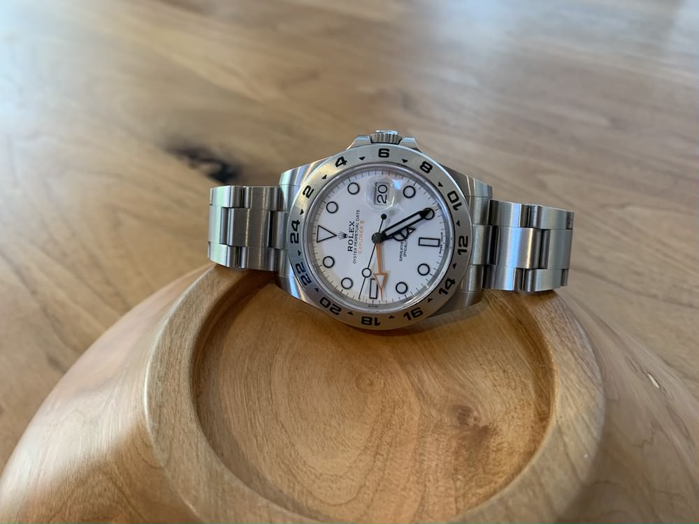 Der Spitzname „Polar“ bezeichnet die Referenzen der Rolex Explorer II mit weißem Zifferblatt. Im Gegensatz zu früheren Uhren, die oft mit einem eher cremeweißen Zifferblatt ausgestattet waren, hat das Blatt der weißen Explorer II ein kaltes weiß als Farbton. Durch die Lünette aus Edelstahl wirkt das weiß noch kälter. Insgesamt gab es vier Referenzen der Explorer II mit weißem Zifferblatt: 16550, 16570, 216570 und die aktuellste Referenz, die 226570. Lediglich die allererste Explorer II Referenz, die 1655, gab es lediglich mit schwarzem Blatt.